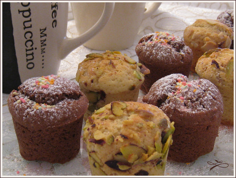 Partagez en 2. Dans la première moitié rajoutez le chocolat. Dans la seconde une cuillère à soupe de fruits secs (noisettes, pistaches) en poudre. Dresser à la poche à douille dans des moules à mini-muffins. Parsemez d'amandes et de pistaches effilées. Au four Th6 pour 20 minutes.